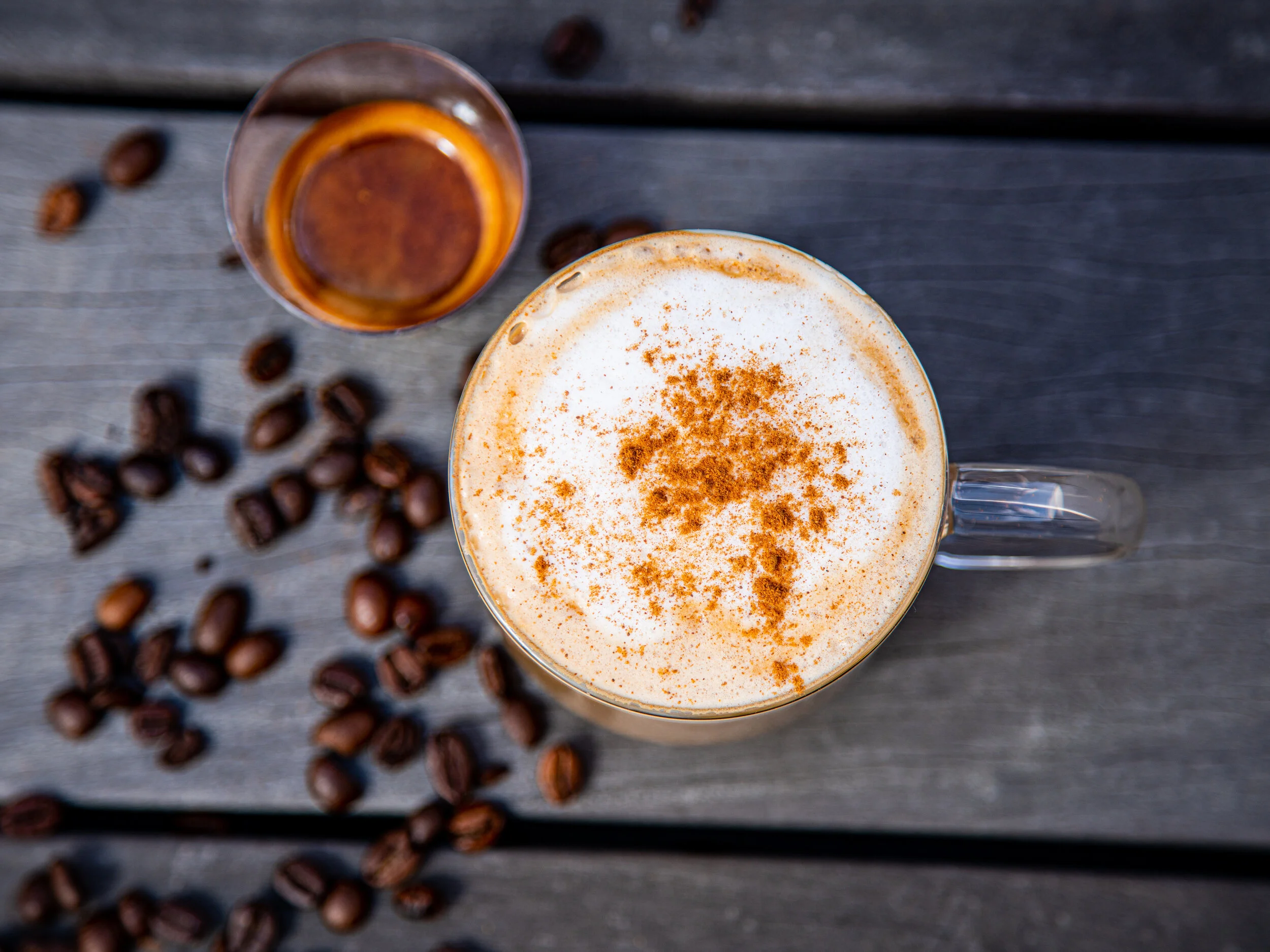 Three cups of coffee and beans